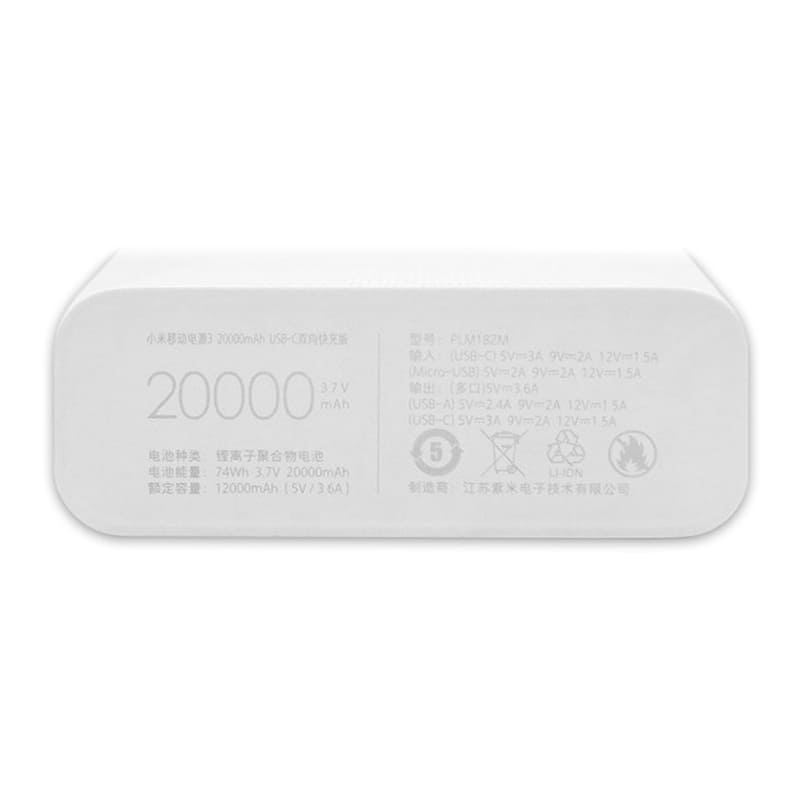 Xiaomi Power Bank 3 имеет два порта USB-A и один порт USB-C. Порт USB-C может выдавать до 18W. При использовании обычного зарядного устройства зарядка займет около 11 часов, при использовании зарядного устройства 18W – на зарядку потребуется до 6,5 часов. Под USB-C находится классическая для индикация заряда в виде 4 диодов белого цвета, каждый из которых представляет примерно 25% от общей емкости устройства. На боковом торце расположена единственная кнопка для проверки уровня заряда внешнего аккумулятора.