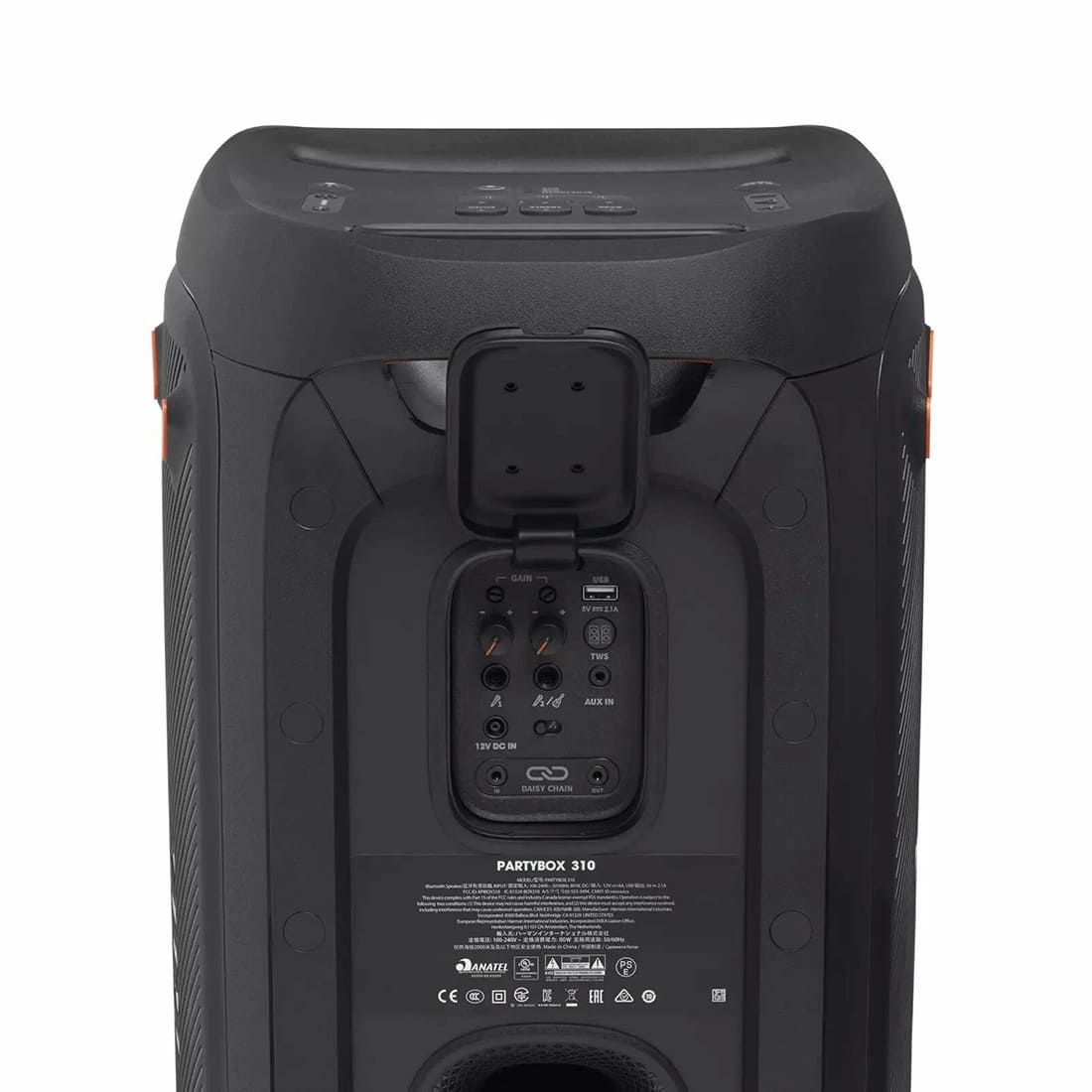 Управление JBL PartyBox 310 осуществляется с помощью 17 крупных кнопок, расположенных на верхней панели устройства. Также имеется разъём для сетевого шнура и гнездо питания, защищённые от брызг воды (IPX4).